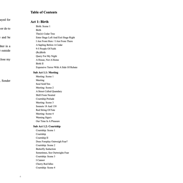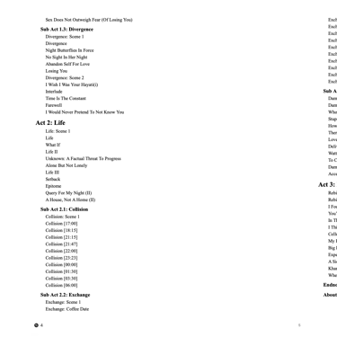 TMFL is divided into three acts, with two including sub acts. The acts focus on three key players, The Universe, The Sun, and The Moon. Each act marks distinct turning points in life with new lessons (mostly) taken into account in the next act. Sometimes we have to learn the same lesson multiple times.